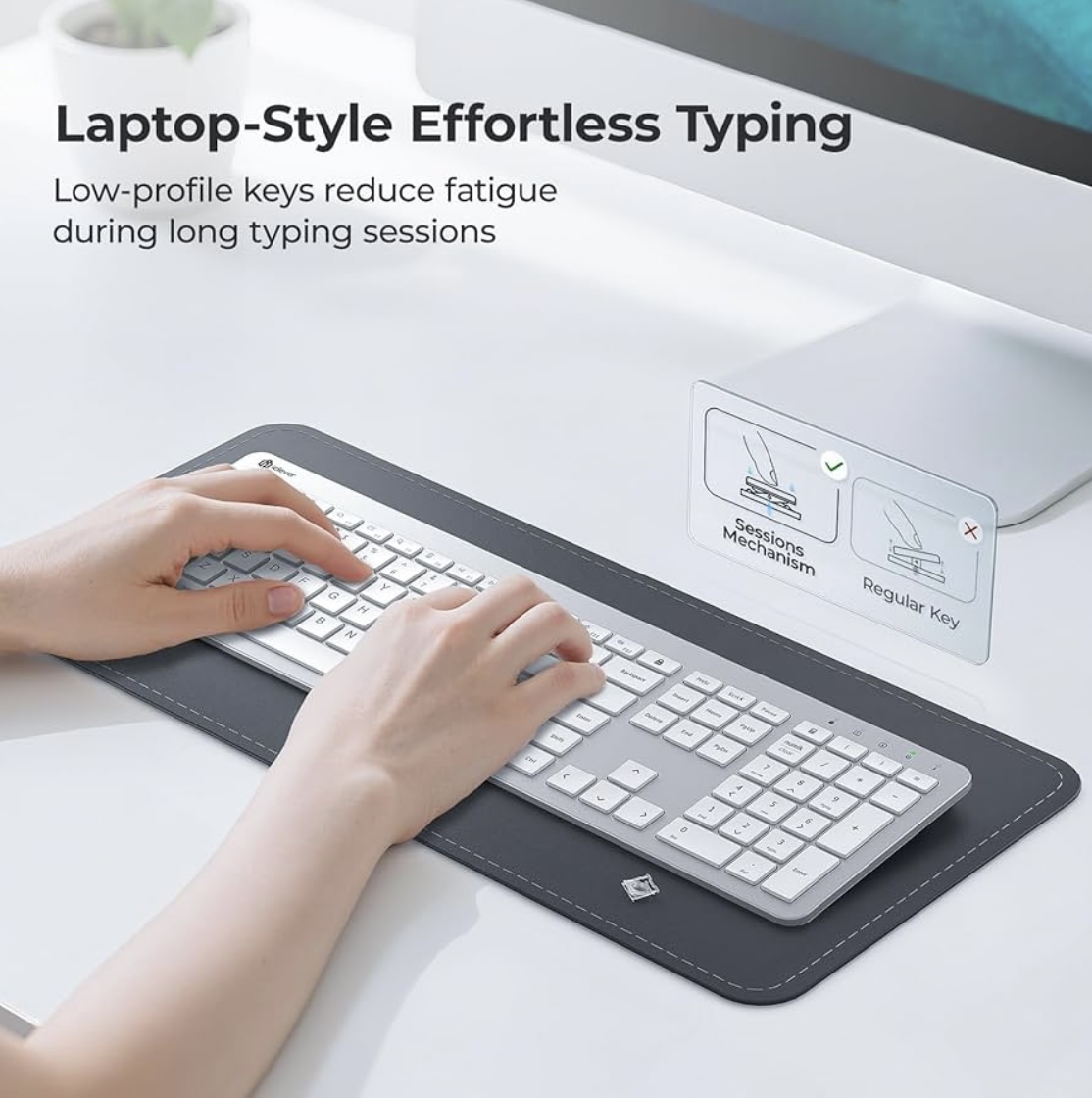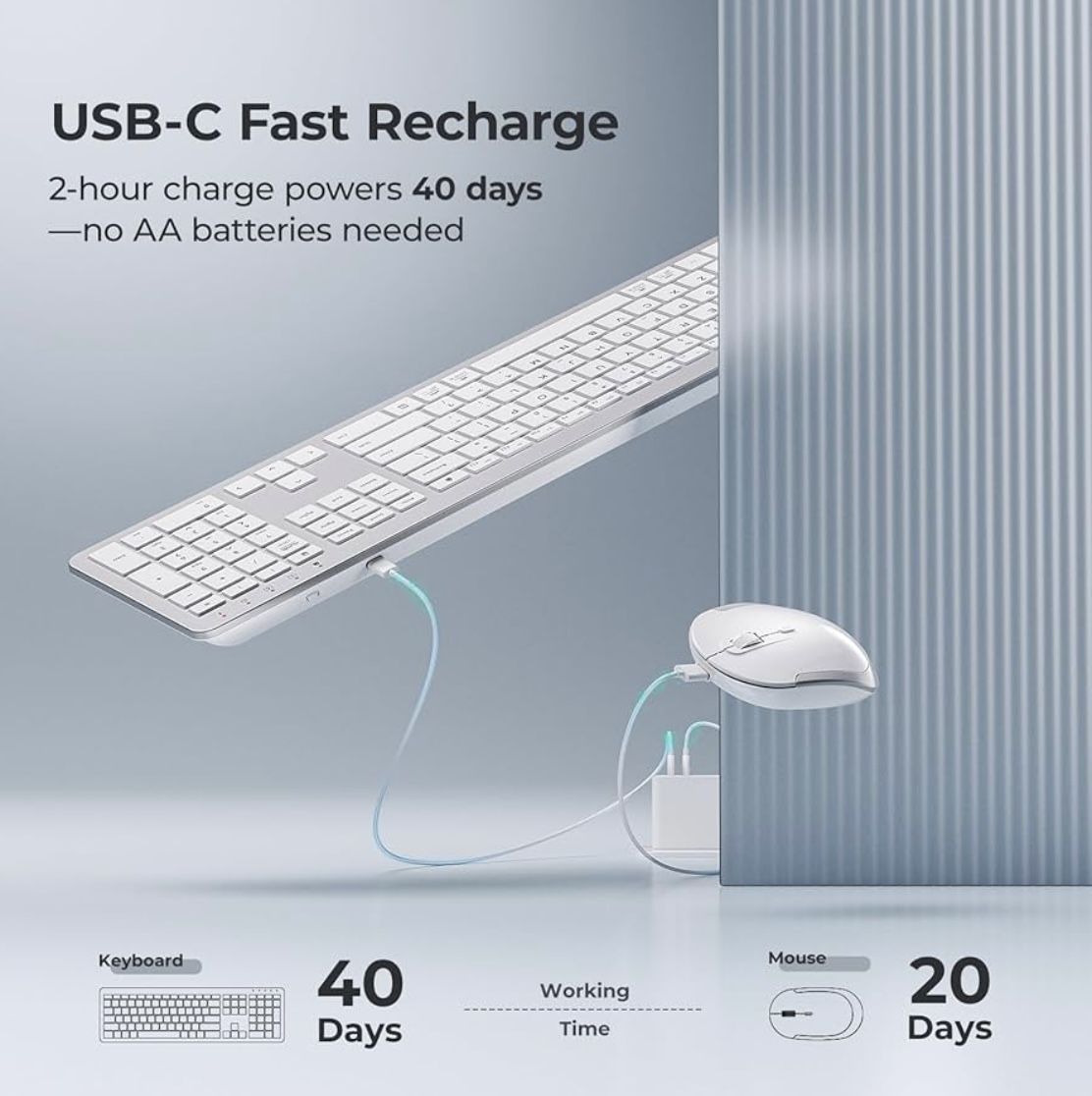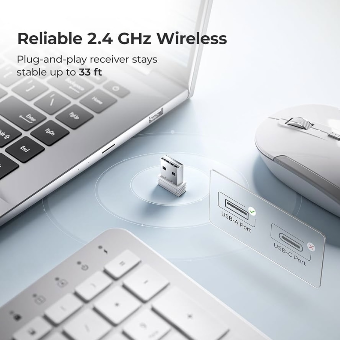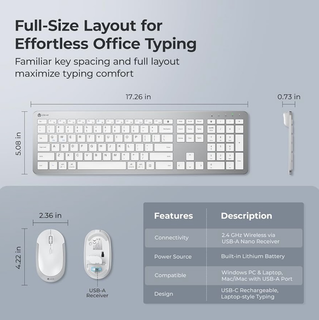 Category: Office & Productivity Tags: 2.4G USB, 3-Level DPI, iClever GK08 Wireless Keyboard and Mouse Combo - Full-Size Ergonomic Keyboard with Number Pad, Quiet Click, Rechargeable, Silver, Slim Design for Windows/Mac