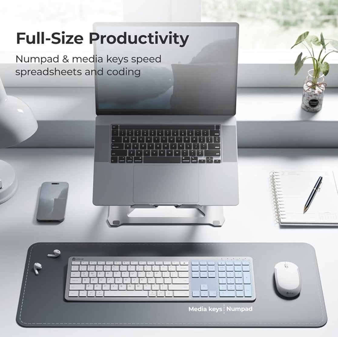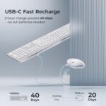 iClever GK08 Wireless Keyboard and Mouse Combo – Full-Size Ergonomic Keyboard with Number Pad, 2.4G USB, Quiet Click, 3-Level DPI, Rechargeable, Slim Design for Windows/Mac, Silver