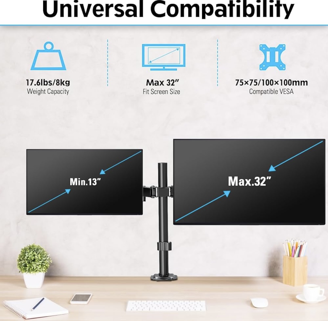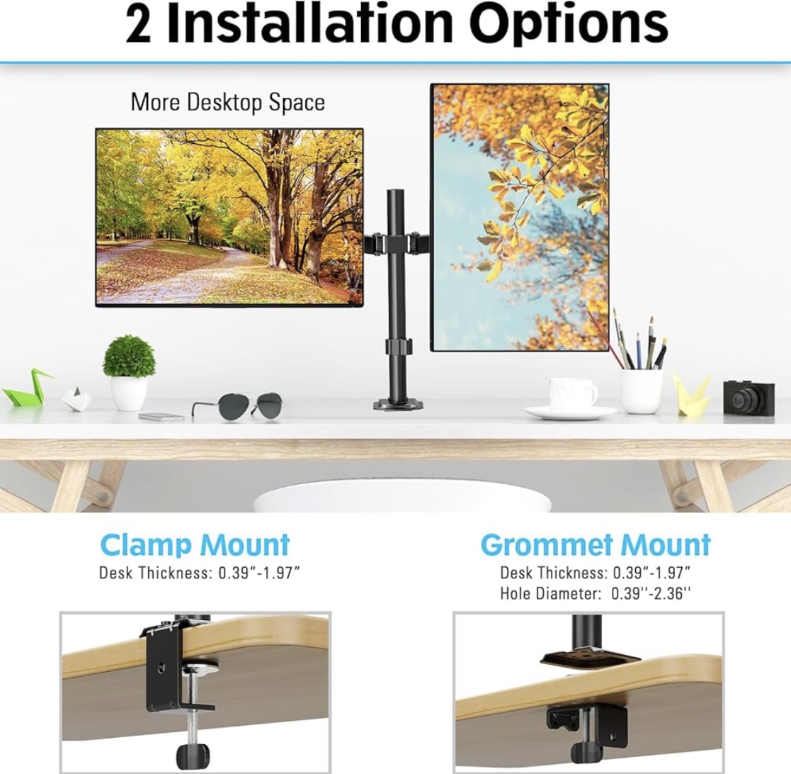 Category: Office & Productivity Tags: Dual Monitor Stand with C-Clamp and Grommet Base, Fully Adjustable Dual Monitor Arm for 2 LCD Screens, Max 32 Inch up to 17.6lbs, MOUNTUP Dual Monitor Desk Mount
