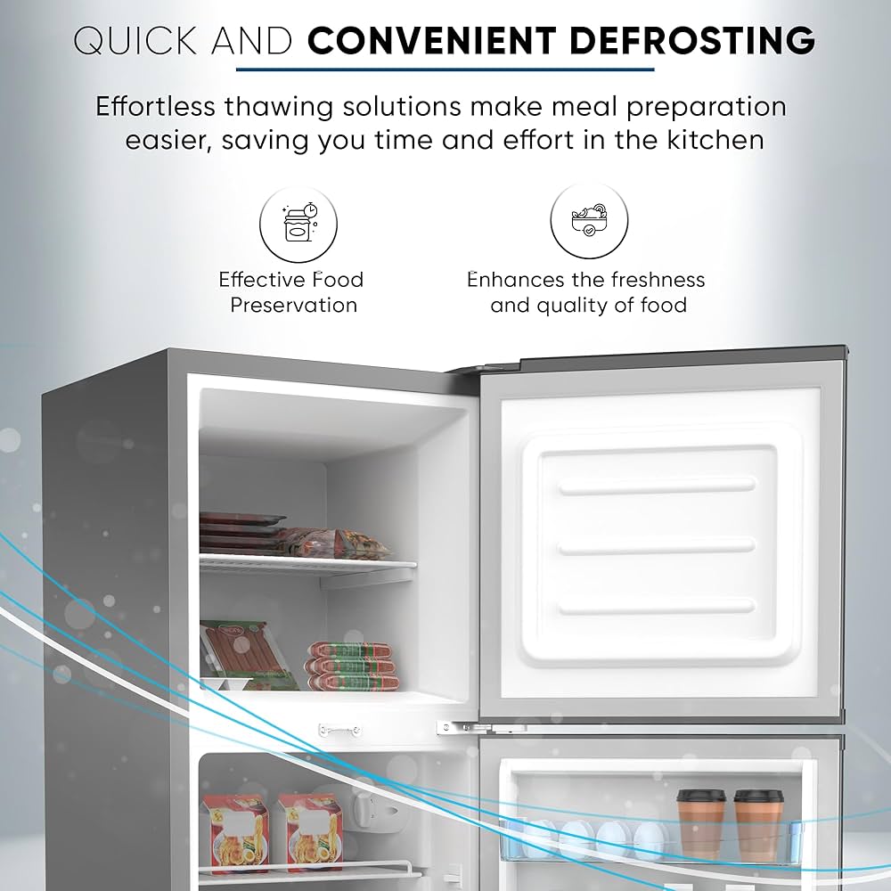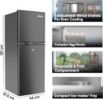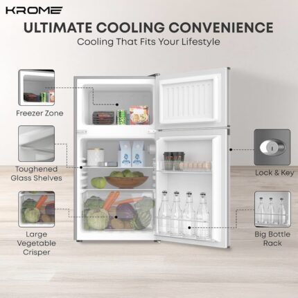 KROME Double Door Refrigerator, 138L Gross / 90L Net Capacity, Direct Cool, Top Mount Freezer, Glass Shelves, Lock & Key, Dark Silver Finish, R600a Refrigerant, KR-RF138DDSG