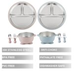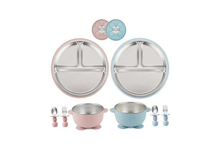 PandaEar 8PCS Baby Feeding Set | Stainless Steel Suction Plates and Bowls with Silicone Fork and Spoon Utensils | Baby Led Weaning Tableware for Toddlers & Kids (Pink & Blue)