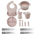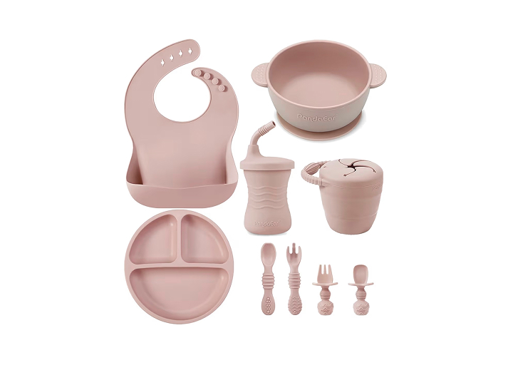 PandaEar Silicone Baby Feeding Set | 9PCS Baby Led Weaning Supplies Self Feeding Utensils | Divided Suction Plate Bowl Bibs Sippy Cup with Baby Snack Container Spoons Forks (Pink)